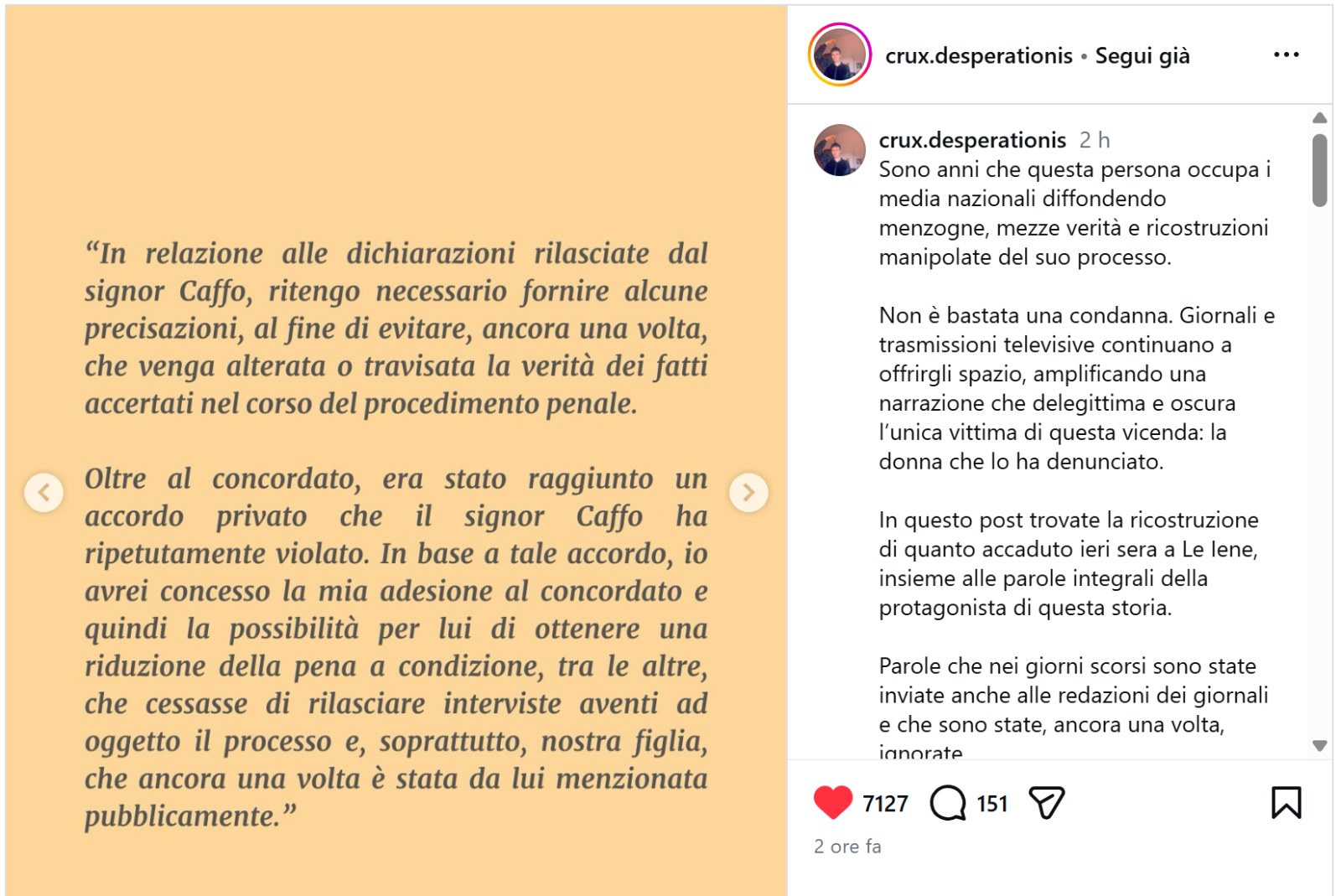 Questa dichiarazione è stata pubblicata in coda a un post di Crux Desperationis su Instagram. In relazione alle dichiarazioni rilasciate dal signor Caffo, ritengo necessario fornire alcune precisazioni, al fine di evitare, ancora una volta, che venga alterata o travisata la verità dei fatti accertati nel corso del procedimento penale. Oltre al concordato, era stato […]