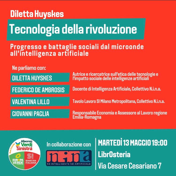 Il 13 maggio presenteremo un libro bello e importante, vicino a noi come temi, si chiama “Tecnologia della rivoluzione” scritto Diletta Huyskes, saremo a Librosteria. Lo faremo in collaborazione con Sinistra Italiana, con molti invitati informali, perché diciamolo, la nostra è un’alzata di cresta, è una scommessa andata un po’ in là e la politica è sempre il sortire insieme.