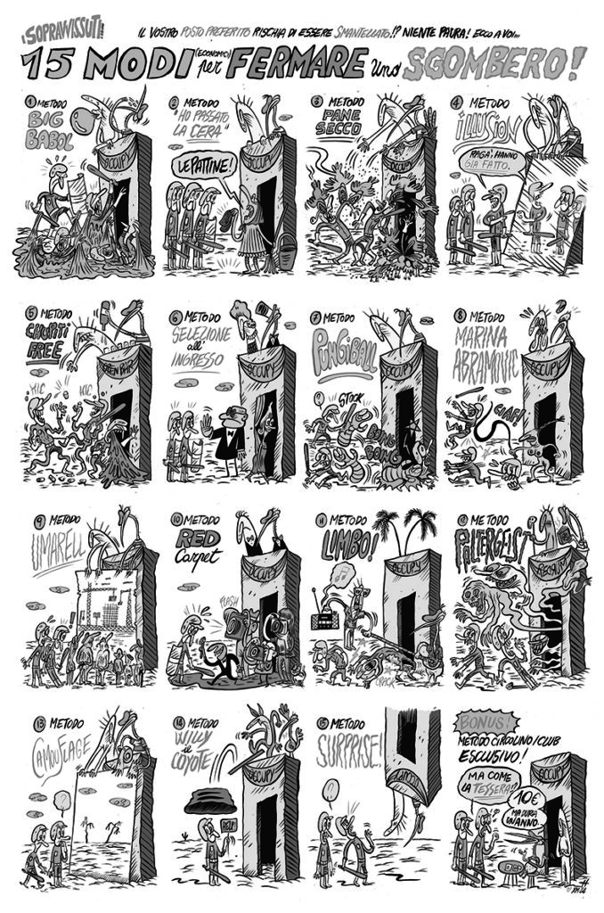 Ci saranno anche mostre: la multinazionale Eni ha presentato un’istanza di sequestro preventivo dell’immobile dove sorge la SOS Fornace. Questa richiesta fa seguito ai numerosi sgomberi e sfratti di spazi sociali e luoghi culturalmente vivi avvenuti a Milano. Sono stati immaginati dunque assieme a tante personalità del mondo del fumetto diversi metodi per resistere nell’ironica mostra 1001 modi per evitare uno sgombero”. Tra le varie opere troverete lavori di Dan&Dav, Federica Ferraro, Fulvio Fontana, GGT, Hurricane Ivan, Jazz Manciola, Martoz, Spugna e molti altri ancora!