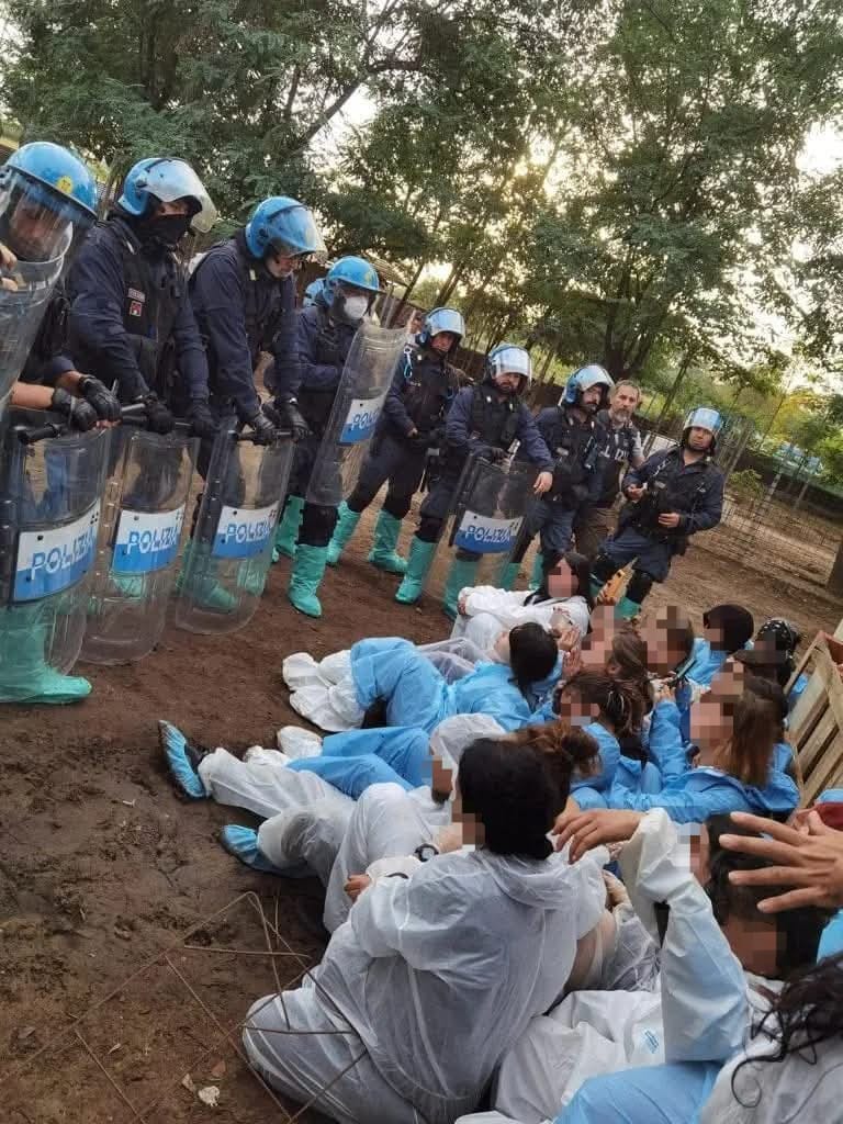 Questa estate un gruppo antispecista ha manifestato senza preavviso ad Arborio, incatenandosi davanti a un cantiere che prevede l’apertura di un allevamento intensivo di 270mila galline. Nonostante le temperature altissime le forze dell’ordine hanno impedito il rifornimento di acqua e coperture: per questo e altri motivi due attiviste sono state portate al pronto soccorso. Tre attivistə hanno presentato una querela. Sono stati emanati fogli di via non solo da Arborio ma anche da Vercelli nonostante a Vercelli non siano stati commessi atti illegali.