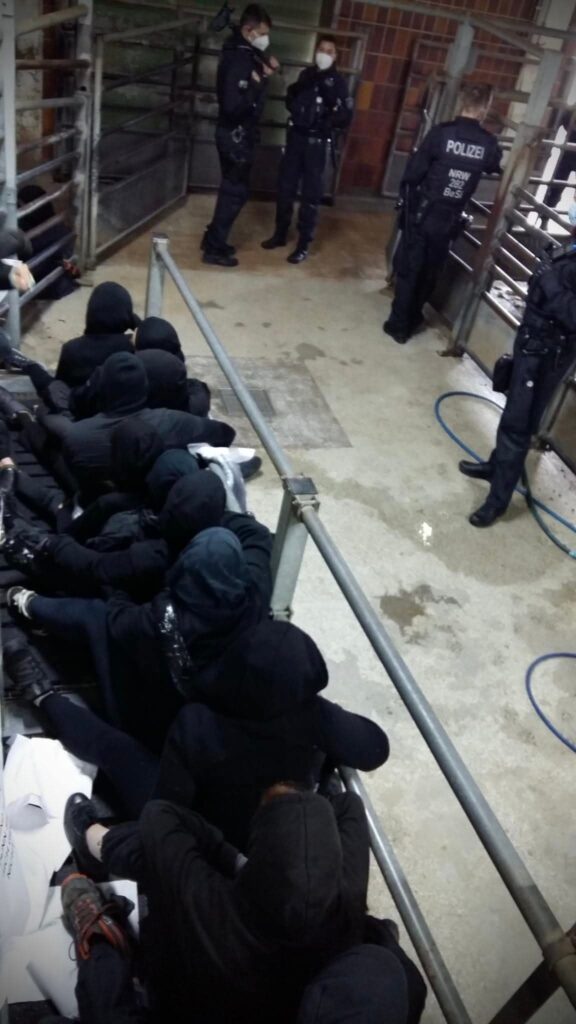 La repressione è un fatto importante anche all’estero, per azioni cui partecipano anche compagnə italianə. Quest’anno in Francia molte attiviste a seguito di un blocco simultaneo di mattatoi sono state picchiate, offese con insulti razzisti, trascinate per molti metri con il seno scoperto, umiliate in celle di isolamento senza servizi base; sono state sequestrate auto e ogni effetto personale ritardando di molti giorni la possibilità di tornare in patria. Sono stati provocati deliberatamente ingenti danni economici allə attivistə. Una di loro, dopo lo sgombero è stata immobilizzata e costretta a guardare come gli animali venissero condotti dai camion verso il mattatoio.
