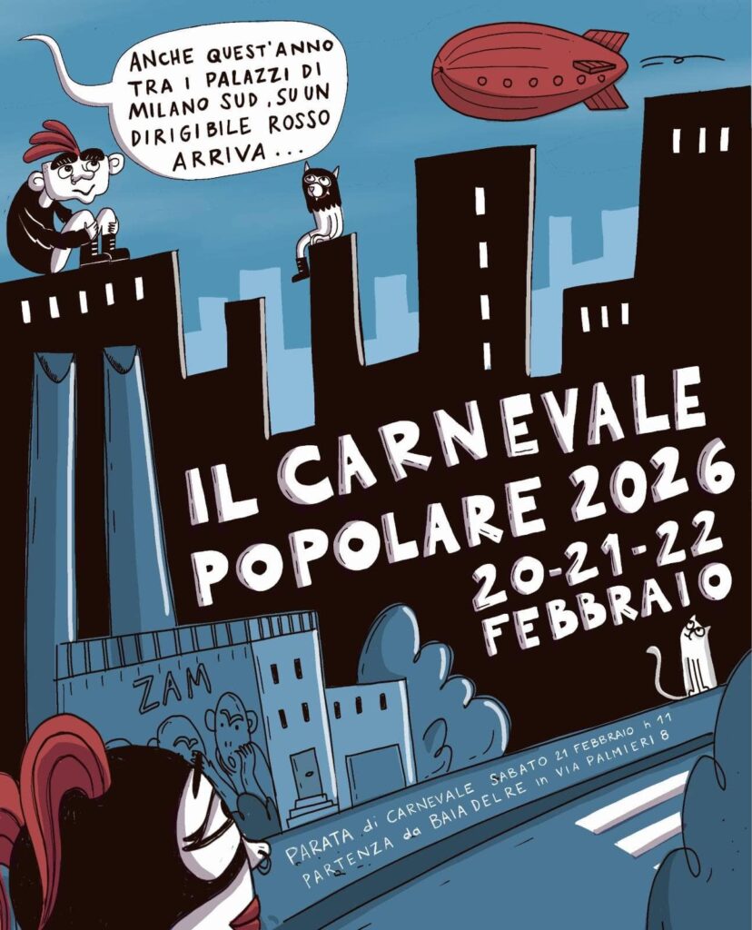 A Milano Sud, nel quartiere Stadera, si scorge nel cielo il ritorno del dirigibile rosso Baia del Re…il Carnevale Popolare è tornato!
