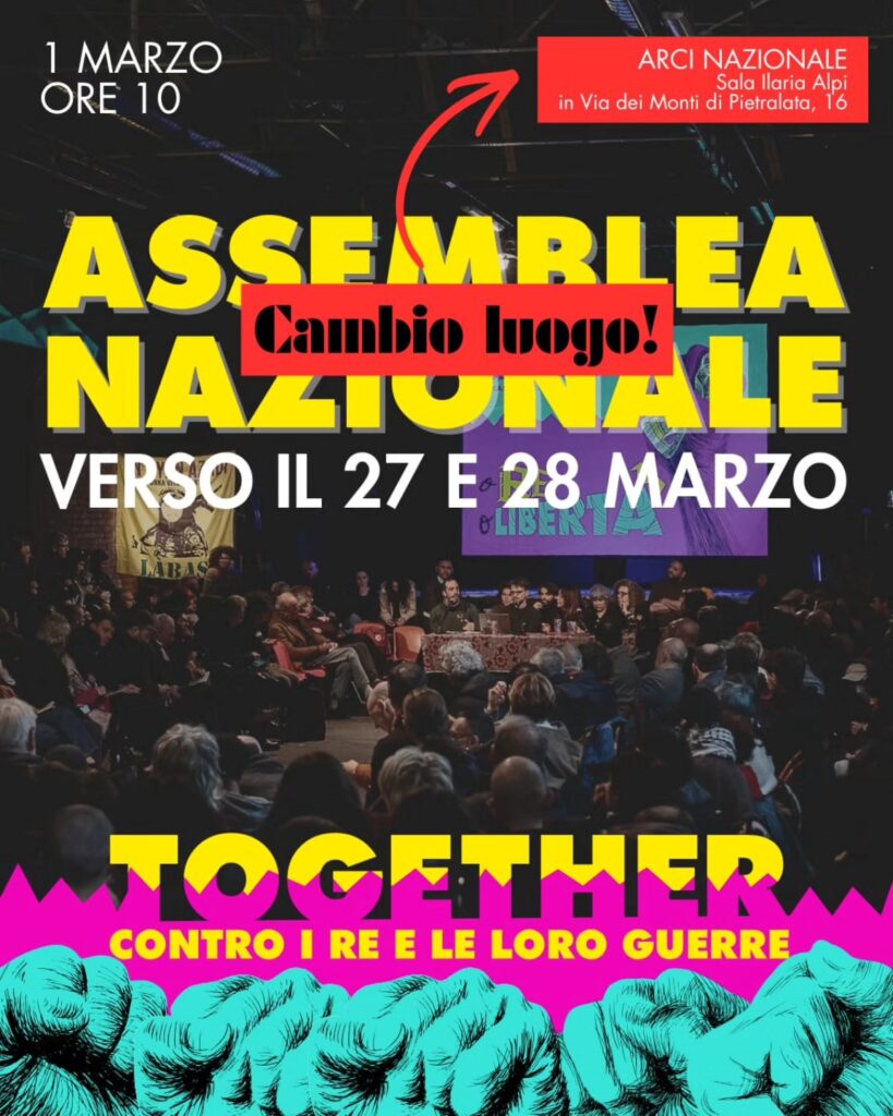 La prossima domenica 1 marzo a Roma ci sarร  lโ€™Assemblea Nazionale No Kings per preparare la grande mobilitazione internazionale โ€œTogetherโ€ contro i re e le loro guerre, contro il governo Meloni, il suo progetto politico e la torsione autoritaria. La stessa aula di novembre scorso, quando, in continuitร  con le grandi mobilitazioni al fianco del popolo palestinese, tantissime realtร , organizzazioni, collettive, hanno per la prima volta risposto alla necessitร  di una convergenza reale, verso unโ€™obiettivo comune: contrastare il nuovo fascismo globale, la rinnovata stretta repressiva, la dinamica di guerra permanente in cui ogni sistema di potere, compresa lโ€™Unione Europea, ha scelto di stare.